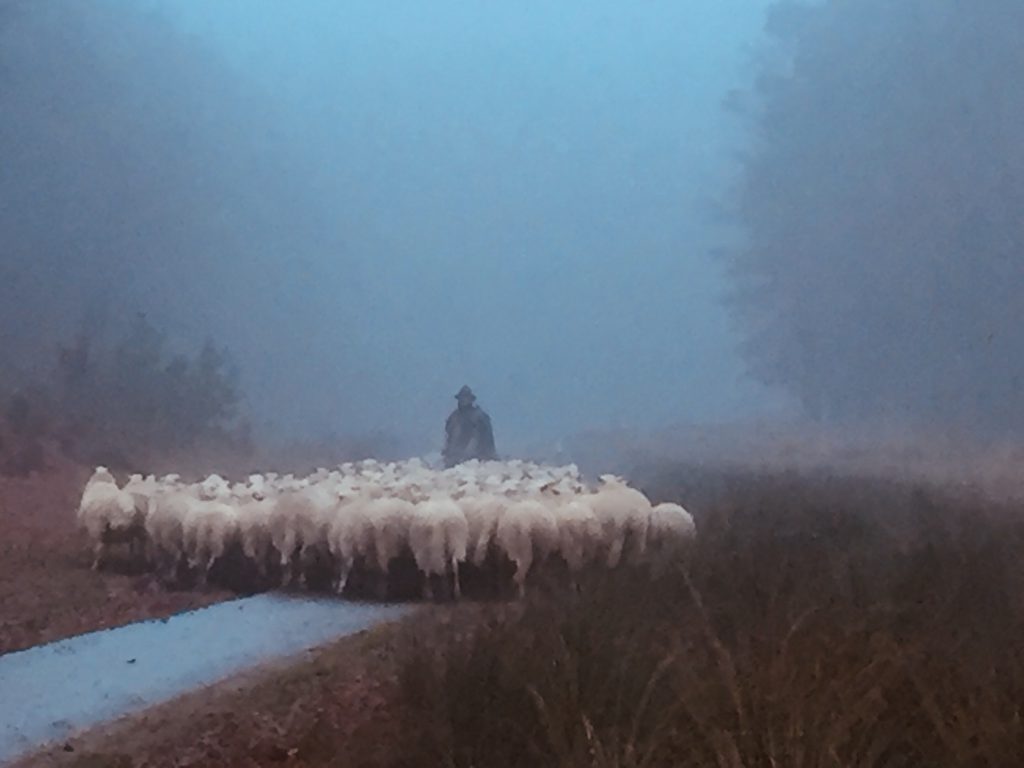 “Vanmiddag rond de klok van vier op de hei tussen Hoenderloo en Kootwijk. De kudde met herder en hond passeerde mij. Zo mooi….”